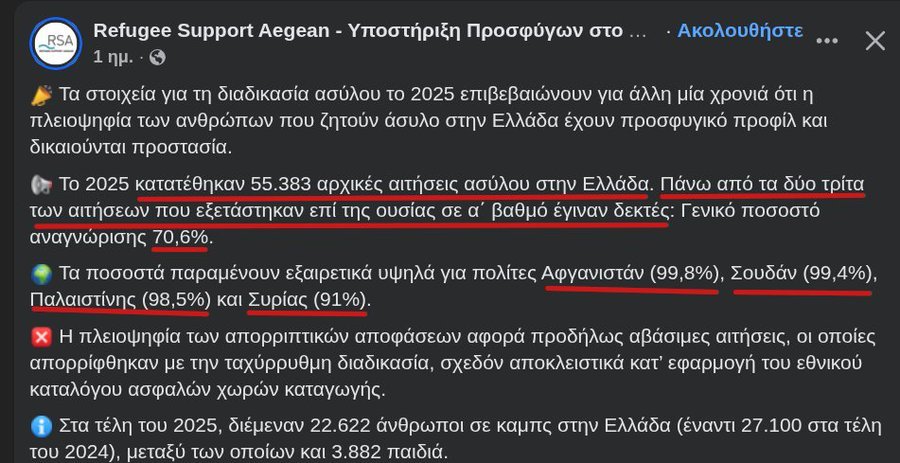 Στα τέλη του 2025, η Υποστήριξη Προσφύγων στο Αιγαίο (RSA) δημοσίευσε στοιχεία που προκαλούν οργή σε κάθε Έλληνα που αγαπά την πατρίδα του. Η κυβέρνηση Μητσοτάκη, που υποτίθεται ότι «φρουρεί» τα σύνορα και «προστατεύει» την εθνική ασφάλεια, κατάφερε να μετατρέψει την Ελλάδα σε μηχανή μαζικής νομιμοποίησης λαθρομεταναστών.